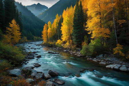 Beautiful autumn landscape with mountain river and yellow trees in the mountains