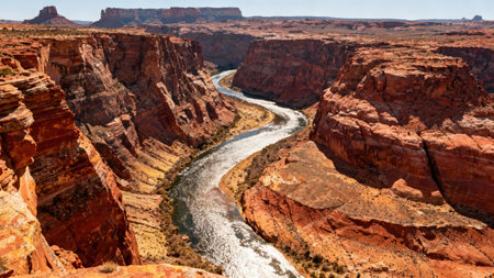A tranquil river flows through a rocky canyon, surrounded by vast landscapes under a clear blue sky. A perfect outdoor escape for nature lovers.