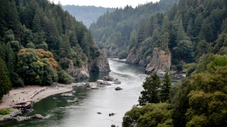 A view of a river that is surrounded by cliffs, AI