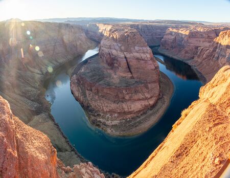 Golden hour view of Colorado river crossing a canyon in Page in Arizona USA