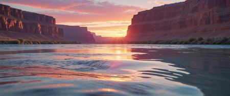 AI Generated. Sunset Over a Serene Canyon River with Reflections on Water