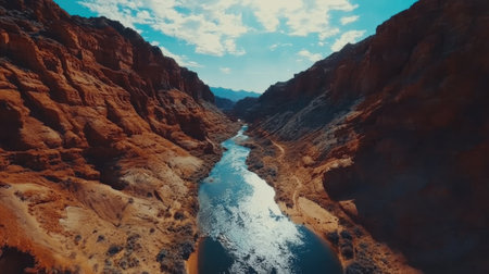 An aerial perspective showcasing a river cutting through a deep canyon, winding its way through the rocky terrain surrounded by steep cliffs and rugged landscape.