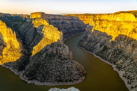 A breathtaking scenic view of a golden sunset from Devil's Canyon Overlook, casting a warm glow over the dramatic landscape of Bighorn Canyon