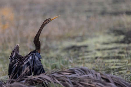 Oriental Darter or Indian snake bird (Anhinga melanogaster) perched near water body to dry the wings.