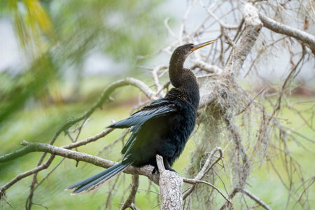 Male Anhinga bird called Anhinga anhinga and snakebird perches near a pond in Naples, Florida