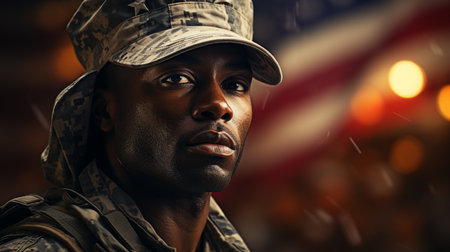 Portrait of young African American soldier on the background of the American flag.
