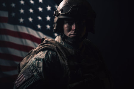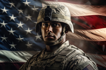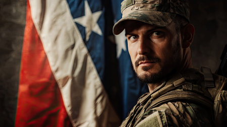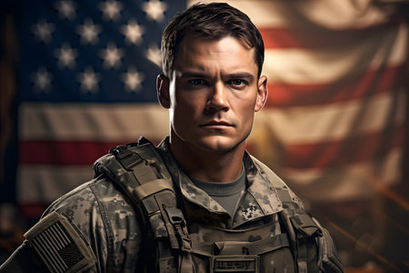 Portrait of a soldier in uniform with an American flag backdrop