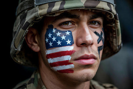 A close-up portrait of a soldier wearing a camouflage helmet with the American flag painted on one side of his face. His gaze is intense, conveying a sense of duty and unwavering commitment.