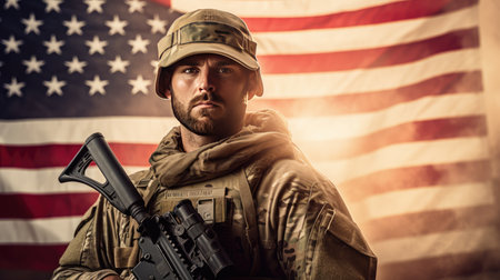 Soldier in uniform. background Flag USA. Memorial Day, remembering the fallen soldiers around the world.