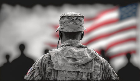 Close-up of a veteran wearing a camouflage uniform and American flag, symbolizing patriotism, military service, and sacrifice