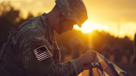 Silhouette of a soldier holding the us flag against a sunset sky, embodying the spirit of memorial day