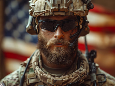 Portrait of a soldier in a military helmet and goggles. American flag in the background.