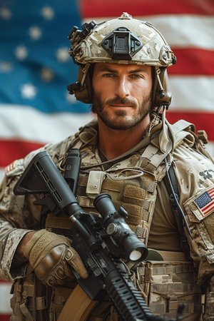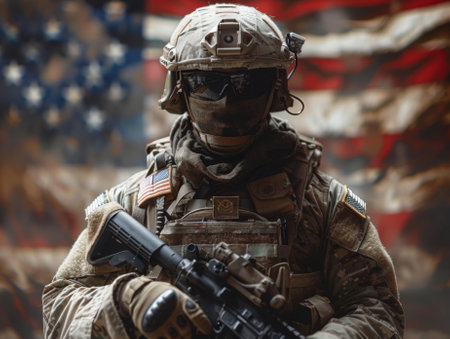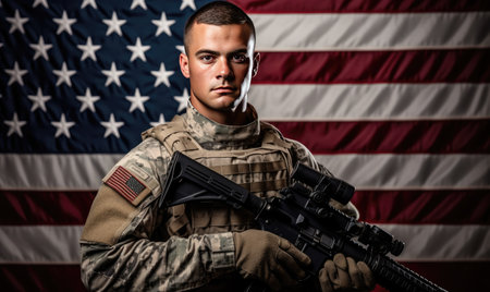 A soldier holding a rifle in front of an american flag