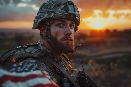 A soldier wearing a helmet and camouflage uniform, with a beard and an American flag patch on his shoulder, stands in a field at sunset.