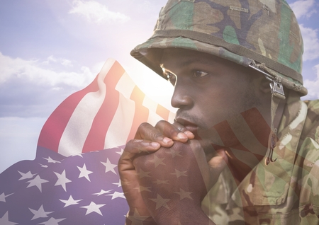 Double exposure of soldier in uniform with american flag. Selective focus.
