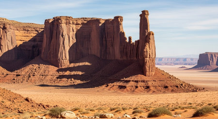 AI Generated. Vast red desert landscape with rocky formations under a bright sky at midday