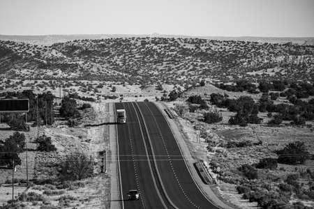 Natural american landscape with asphalt way to horizon. Panoramic picture of a scenic road, USA. Endless straight, Route 66.