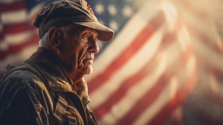 Profile of an elderly military veteran with an American flag backdrop. Symbolizes sacrifice, honor, and patriotism.