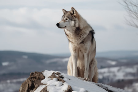 wolf sitting atop snowy hill, surveying its territory, created with generative ai