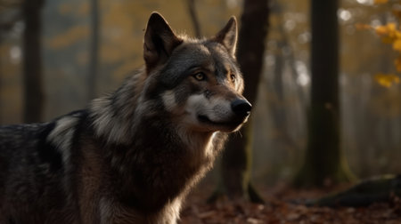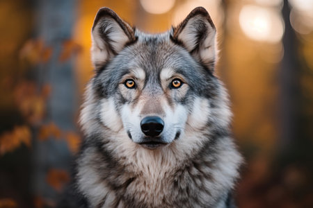Portrait of a wolf in the autumn forest. Beautiful nature background.