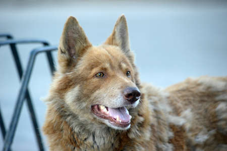 Relaxing eight months old wolfdog male puppy on pier in winter park