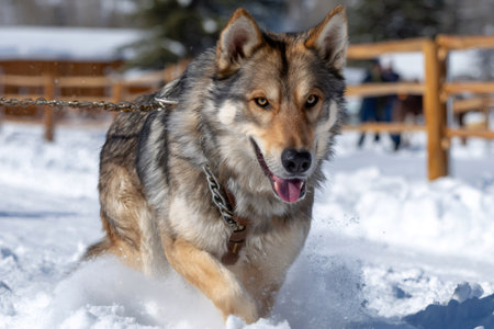 Sled dog running directly at camera, stirring up snow, during a winter dog race