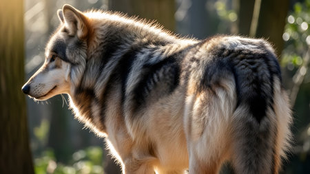A majestic grey wolf stands in a sunlit forest, captured in a profile view looking to the left. The backlighting highlights the texture of its thick fur against a blurred woodland background.