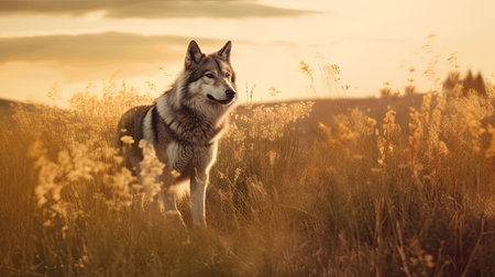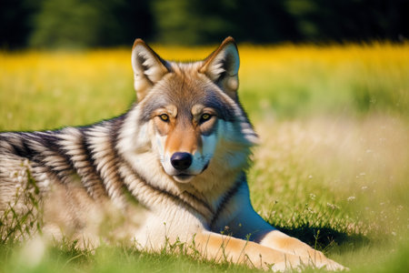 A striking portrait of a wolf sitting amidst a vibrant field of flowers, showcasing the harmonious blend of wildlife and nature. the detailed fur and alert gaze contrast beautifully with the soft floral background, capturing a serene yet powerful moment.