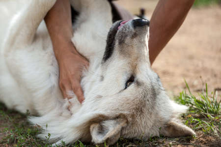 Husky dog ??running outdoors. Entertainment. River. Young dog sitting on the grass outside. Summer.