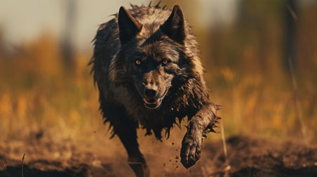 a wolf with dark fur and no spots is captured in a side profile close-up as it runs through a tilled wisconsin field. the photo is beautifully color graded and showcases dramatic lighting, with extreme details and sharp focus. shot on a 70mm lens, the image is hyper-detailed and cinematic, with a depth of field and stunning color grading. ai generated