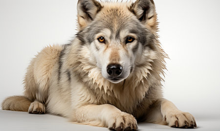 Close up of white wolf with snow background. AI generative and Animal kingdom concept.