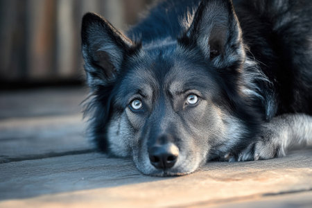 A wolf dog lies relaxed on a wooden floor, showing its soft fur and captivating blue eyes, in soft lighting.