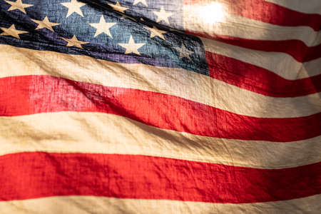 Close up of United of America flag in warm retro style and back light, selective focus, good for USA theme background or 4th of July concept