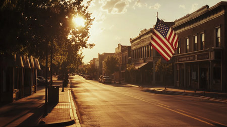 Sunset casts golden light on a quiet Main Street with an American flag