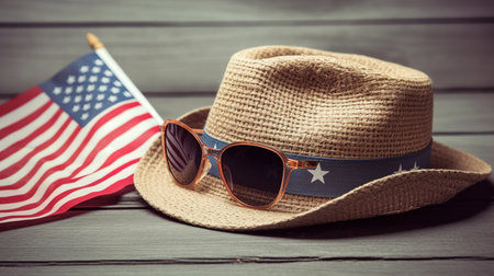 Hat and glasses on a wooden table with American flag. Vintage filter