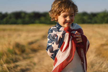 Happy little boy patriot running in the field with American flag. USA celebrate 4th of July