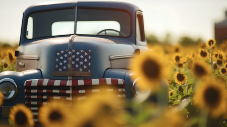 Vintage truck with american flag and sunflower field in background
