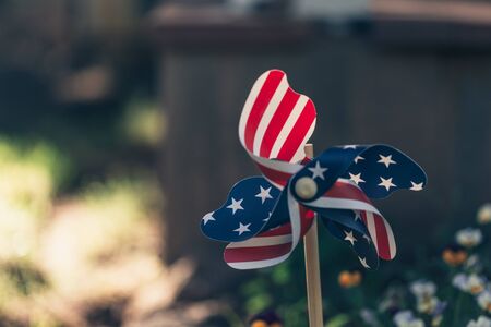 Small garden American flag in the backyard on the wooden stick.