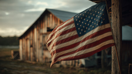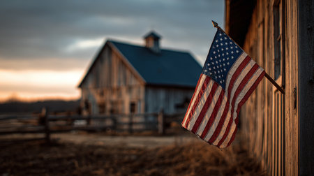 An American flag waves gently in front of a vintage barn at dusk, capturing rustic countryside charm. The soft sunset lighting adds a nostalgic tone to the serene scene.