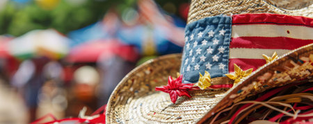 National Flag Day (USA) background with a detailed view of an American flag embroidered on a hat, with a backdrop of a festive event, vibrant decorations, and attendees.