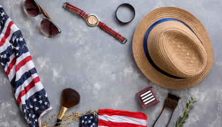 Travel and tourism concept. Top view of American flag, sunglasses, hat, wristwatch, cosmetics on grey background