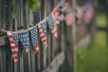 A weathered wooden fence is strung with bunting adorned with flag symbols. Soft focus and natural light create a patriotic and celebratory ambiance, perfect for a neighborhood event.