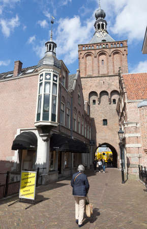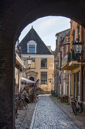 Kampen, The Netherlands, July 30, 2020: looking through the gate underneath the clock tower into the narrow Torenstraat (tower street)