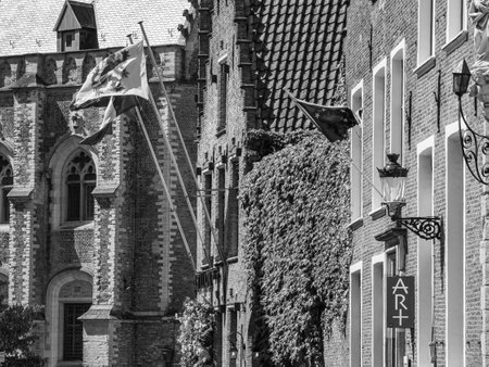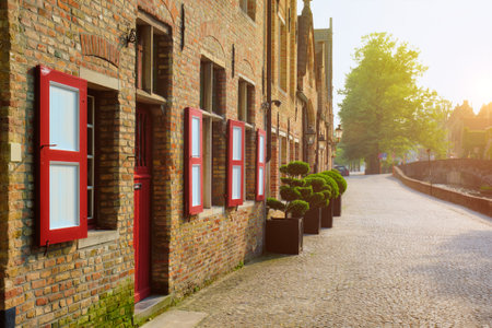 Bruges, flanders belgium. August 2019. Approaching the historic center, the medieval aspect emerges: cobbled streets, low red brick houses.