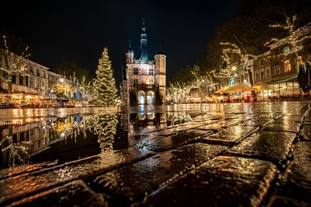 Rainy evening with reflective streets, Christmas lights and monumental buildings in the Dutch village