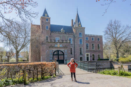 Haamstede in Schouwen-Duiveland, Zeeland, Netherlands. April 26, 2021. Female tourist standing in front of the old Haamstede castle with its bridge and moat, bare trees, a sunny day with a blue sky