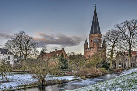 Zutphen, The Netherlands, Januari 15, 2017: view across a wintery landscape towards the tower of one of the old city gates