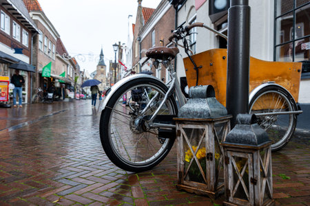Dutch street Hattem Netherlands cargo bike lantern decoration wet brick pavement traditional architecture urban mobility cozy small town atmosphere. Rainy autumn weather calm European travel mood