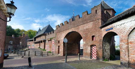 Medieval fortress city wall gate Koppelpoort and Eem River in the city of Amersfoort, Netherlands