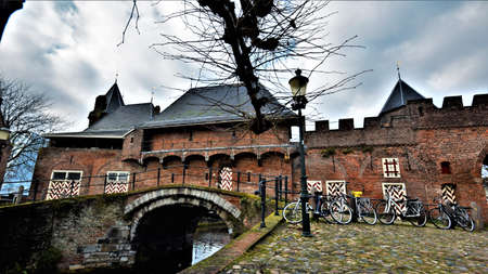 Historical gate with towers in Amersfoort seen from the backside with bridge and water and parked bicycles